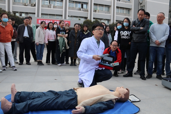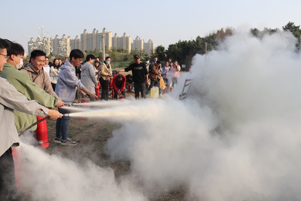 紧急疏散完毕后,师生集合至南侧场地,校医院人员为现场师生进行了AED使用及心肺复苏演示培训,保卫处人员介绍了学校各类灭火器的大致分布,讲解了灭火器的种类及其规范使用方法,现场师生进行了实地灭火演练。